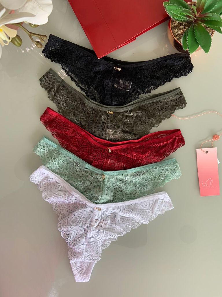 Calcinhas também são variadas, com opções como tanga, fio dental, caleçon e até mesmo tangas com laterais mais largas para um conforto extra.
